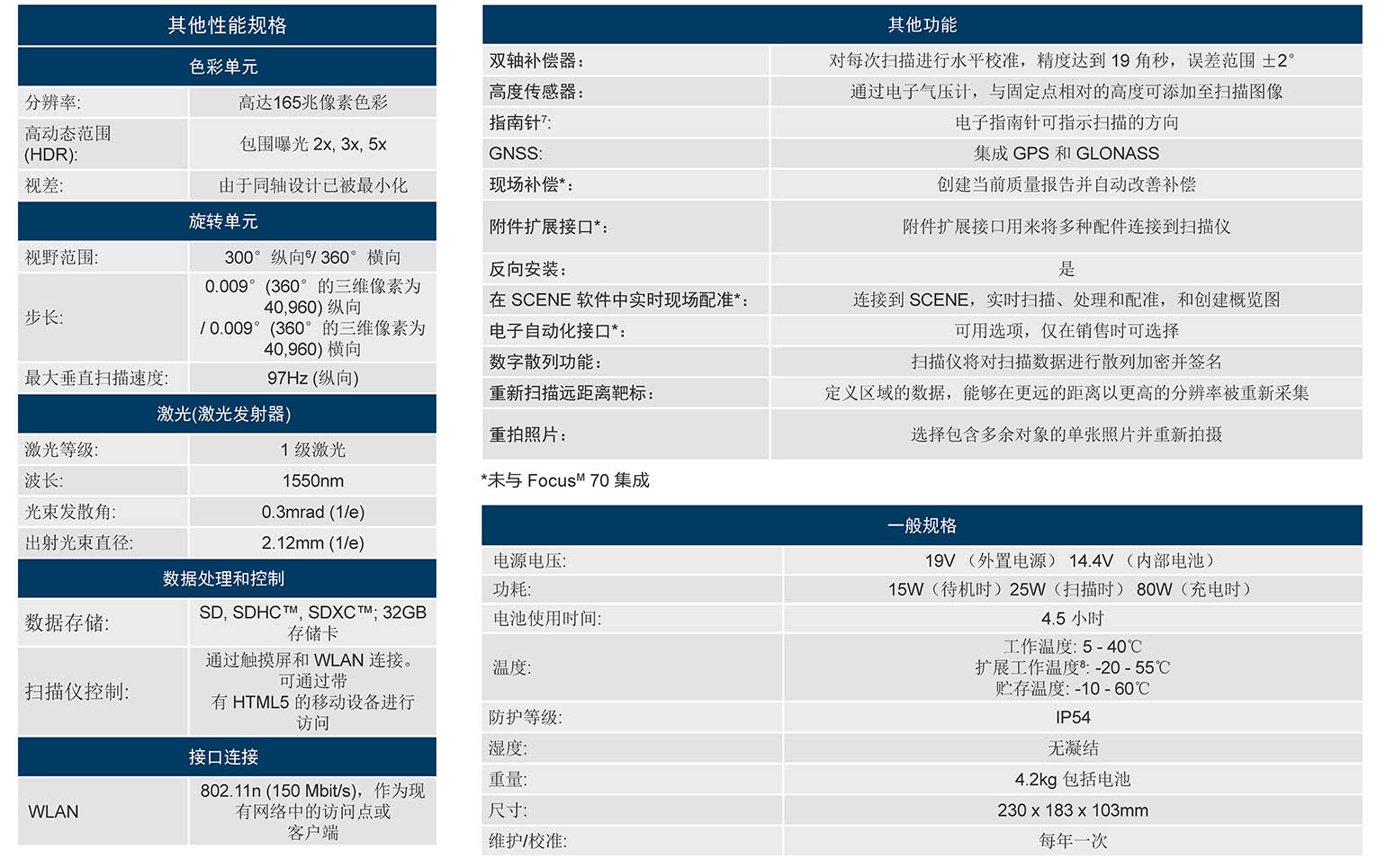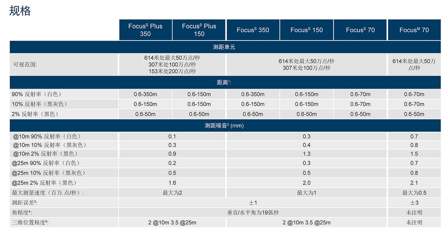 FARO大空间三维激光扫描仪家族产品系列包括FocusS Plus 350,FocusS Plus 150,FocusS 350,FocusS 150,FocusS 70,FocusM 70。各个型号的产品的规格参数如下图。